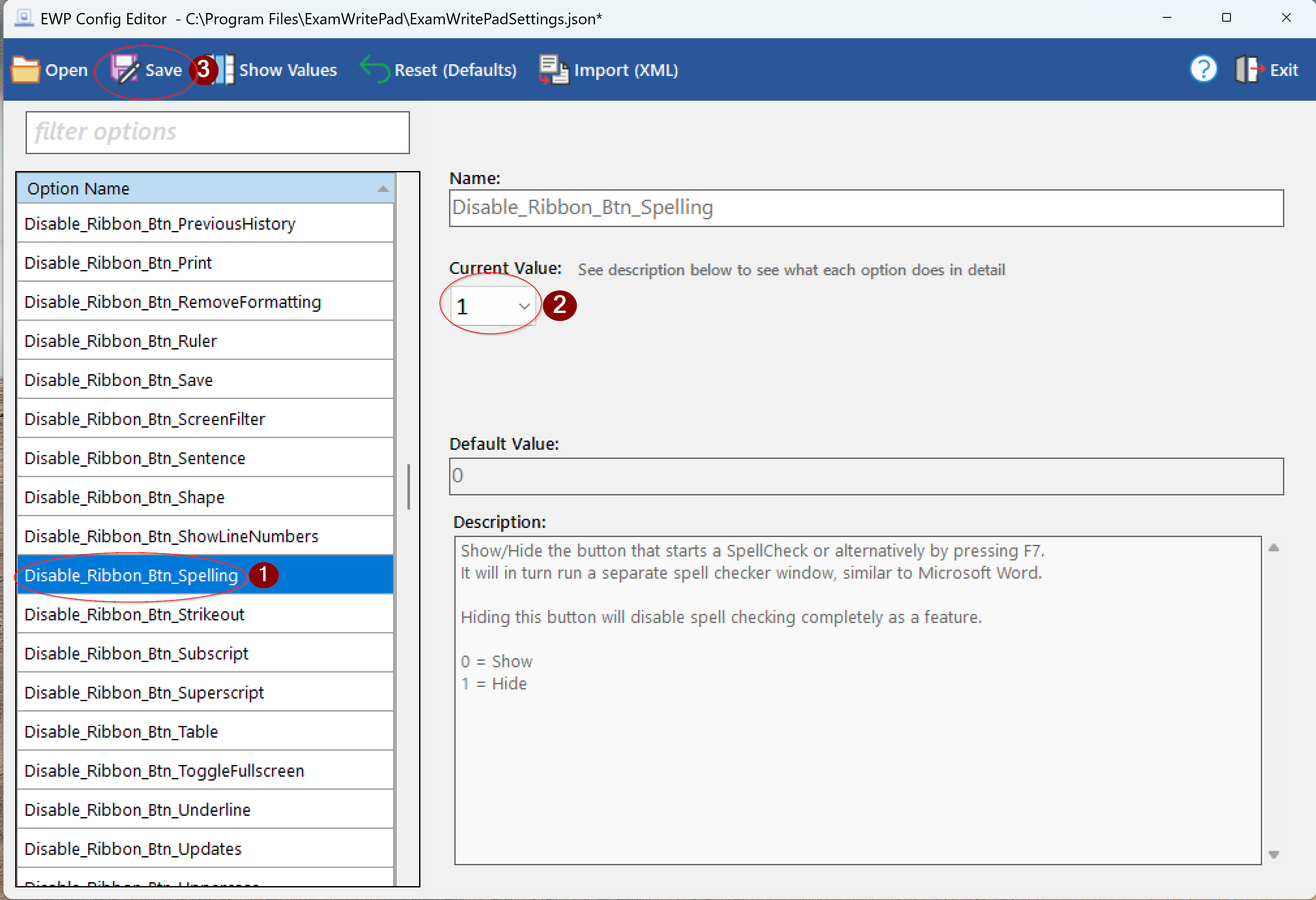 Scroll down and select the option "Disable_Ribbon_Btn_Spelling" and change the current value from ‘0’ to ‘1’.